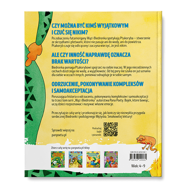 Poruszająca historia o samoakceptacji, odrzuceniu i pokonywaniu kompleksów to trzeci tom serii „Wąż i Biedronka” autorstwa Pana Poety. Bajek, które bawiąc, uczą dzieci rozpoznawać i nazywać własne emocje.