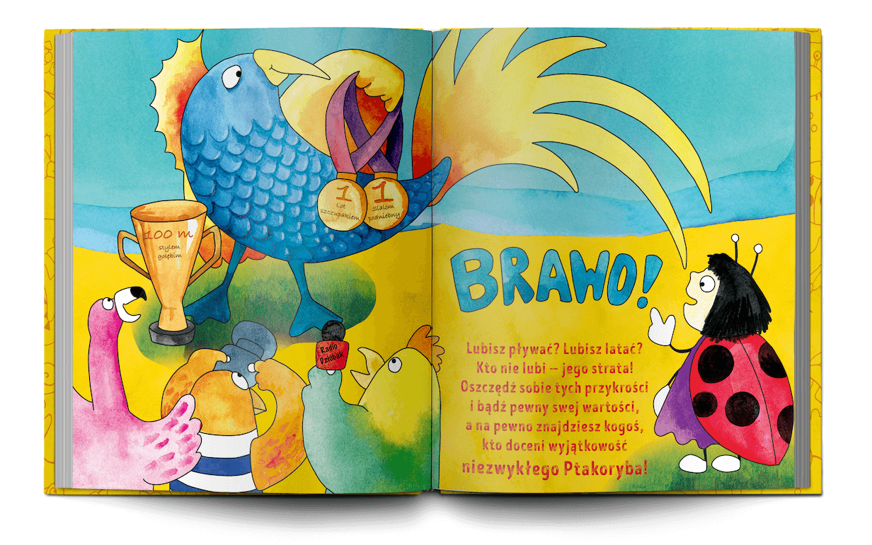 Biedronka pomaga Ptakorybowi spojrzeć na siebie inaczej. W jego niecodziennych cechach dostrzega nie wadę, a wyjątkowość. Od tej chwili nie szuka już uznania dla siebie w oczach innych – bo odnajduje je w sobie samym.